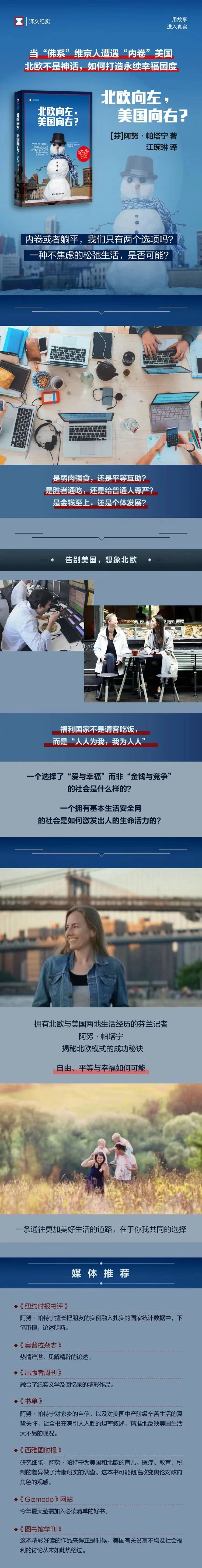 作者简介 阿努·帕塔宁(Anu Partanen),1975年生,芬兰记者、专栏作家,曾经做过教师和广播评论员。她从2008年到美国生活, 2009年通过斯坦福大学的创新新闻奖学金成为《财富》杂志的客座记者,并为《纽约时报》、《大西洋月刊》、《财富杂志》和芬兰的主流出版物撰稿,同时也是英国广播公司(BBC)世界频道的定期广播评论员。在纽约生活了十年之后,她与美国丈夫、孩子一起搬回了芬兰。