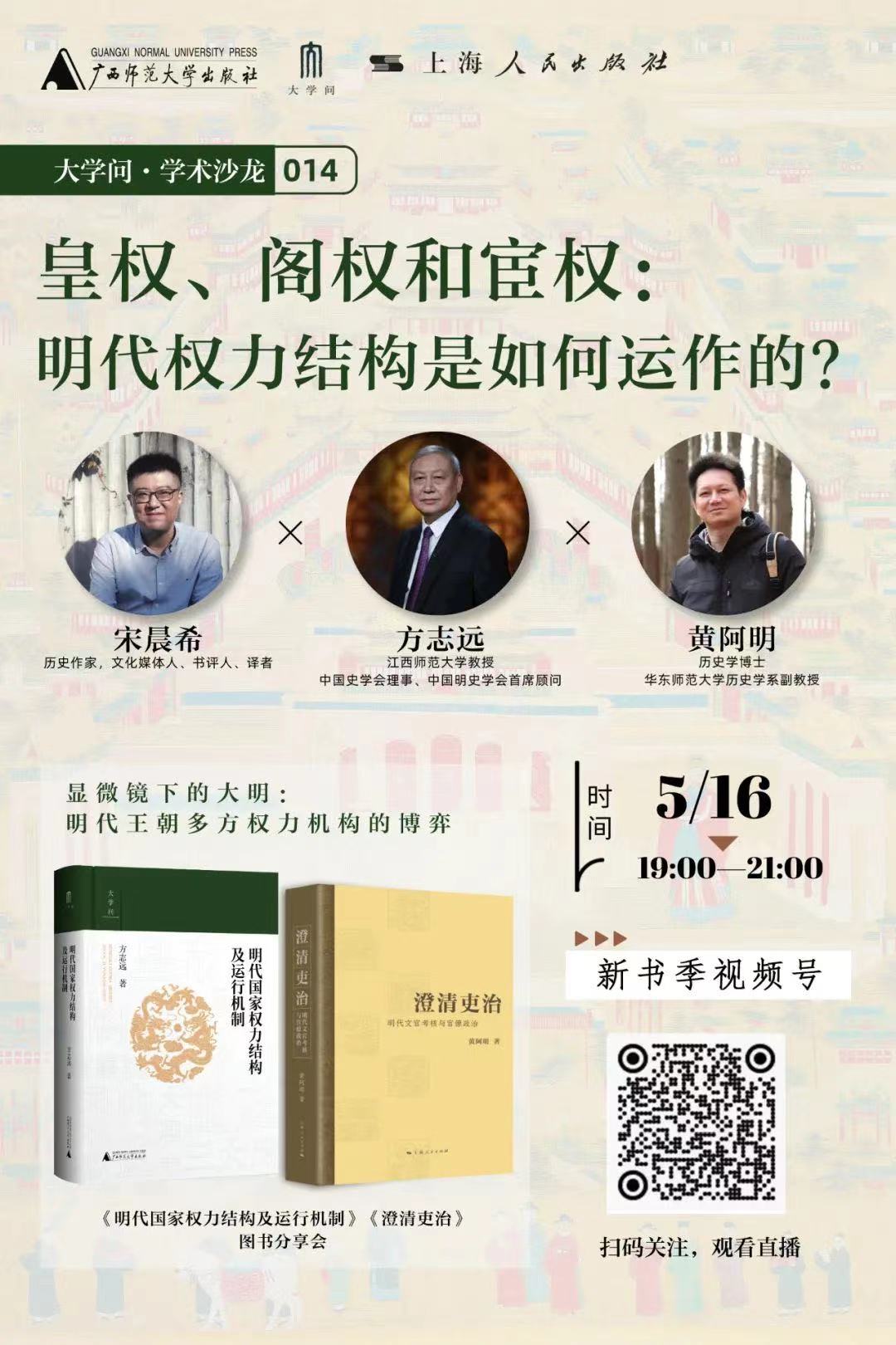 2024年5月16日晚,大学问·学术沙龙(第14期)联合上海人民出版社,邀请江西师范大学教授方志远、华东师范大学历史学系副教授黄阿明、历史作家宋晨希三位嘉宾,围绕图书《明代国家权力结构及运行机制》《澄清吏治:明代文官考核与官僚政治》,聚焦明代制度史,与我们共同分享,明代王朝国家权力的博弈与演变,皇权、阁权及宦权之间的制衡,以及包括文官考核在内制度的设计与变迁如何影响了明王朝的政治生态,乃至埋下王朝灭亡的伏笔。