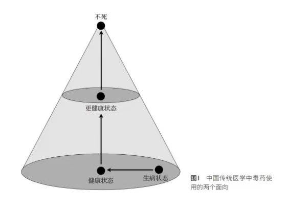 图I显示了古代中国毒药使用的两个面向。在这幅图中,锥体内的任何位置都代表身体的某种状态,底部的圆心指健康的身体,偏离这一中心就是生病的状态,而合理使用毒药可以使身体恢复健康。除了让健康的身体不生病,中国传统医学追求的更高目标是使身体达到“更健康”的状态,为此有时还会借助有毒矿物。如图所示,锥体的截面越小,越往上,“轻健的”身体就越不可能得病。终极目标是把身体推上锥体的顶端,即不再有生病的可能性,也就是“不死”。从祛除疾病到改善健康,再到逃过一死,传统中药学中的毒药在此连续性的过程中发挥至关重要的作用。