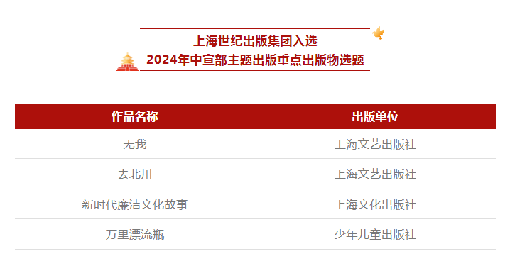 近日,中央宣传部办公厅印发通知,公布2024年主题出版重点出版物选题(点击查看完整名单)。根据《中央宣传部办公厅关于做好2024年主题出版工作的通知》(中宣办发〔2024〕18号),各地区各部门各出版单位精心组织上报主题出版选题2528种。经评审论证,最终确定2024年主题出版重点出版物选题171种,其中图书选题151种、音像电子出版物选题20种。 其中,上海世纪出版集团4种入选:上海文艺出版社3种(含上海文化出版社1种),少年儿童出版社1种。