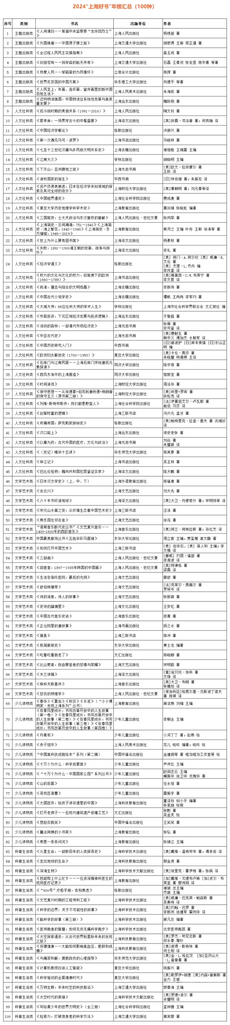 1月9日,在2025北京图书订货会上,上海市出版协会、上海出版社经营管理协会、上海市书刊发行行业协会联合发布2024“上海好书”100种,分为主题出版类、人文社科类、文学艺术类、少儿读物类、科普生活类,现发布100种图书书目: