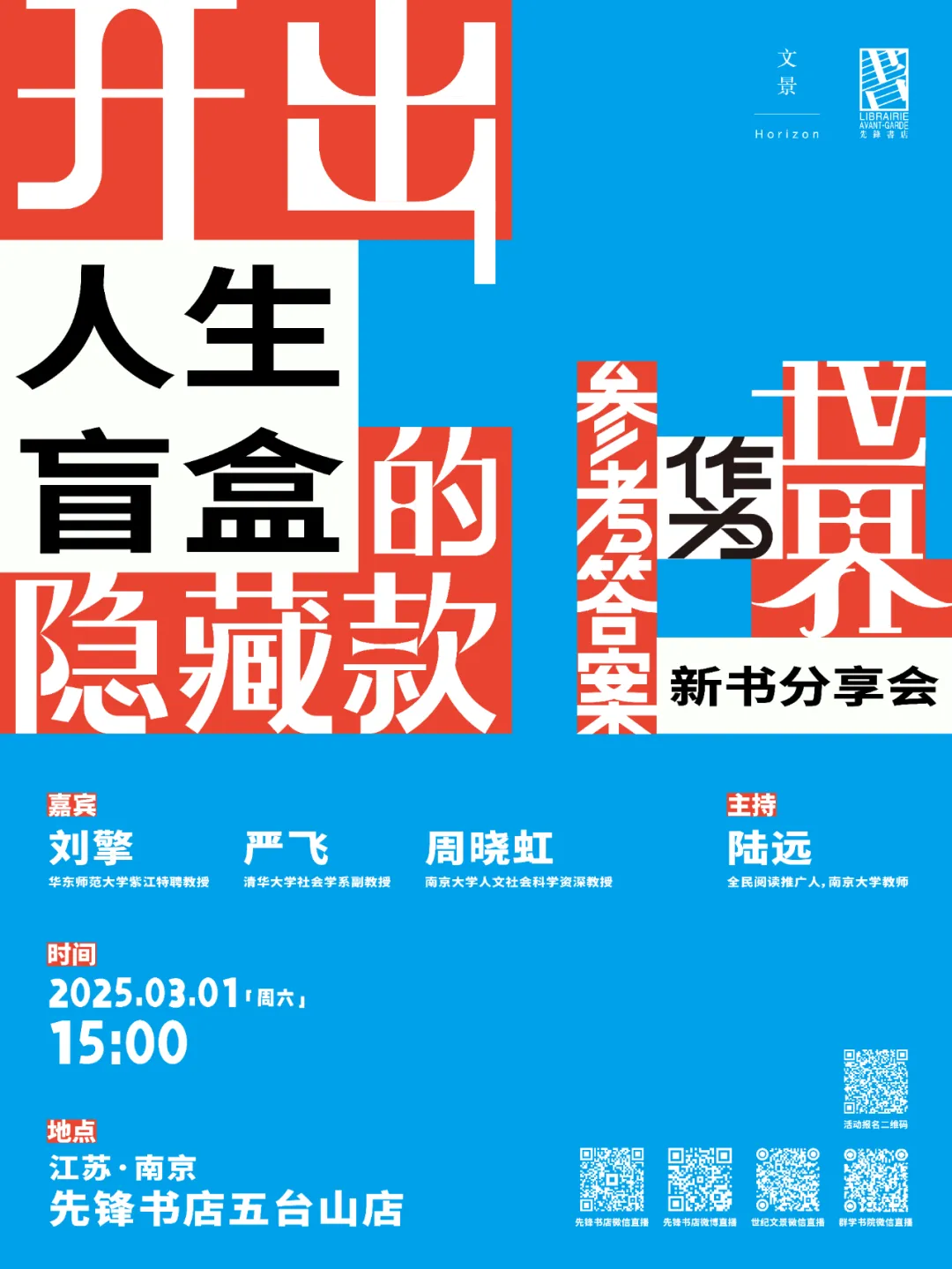 2025年3月1日(周六)15:00,我们邀请了《世界作为参考答案》一书的两位作者——华东师范大学紫江特聘教授刘擎和清华大学社会学系副教授严飞做客南京先锋书店五台山总店,与南京大学人文社会科学资深教授周晓虹展开对谈,并由全民阅读推广人、南京大学教师陆远主持,与大家一起聊聊如何换一个角度看待自我和世界,找到心灵栖息之所。