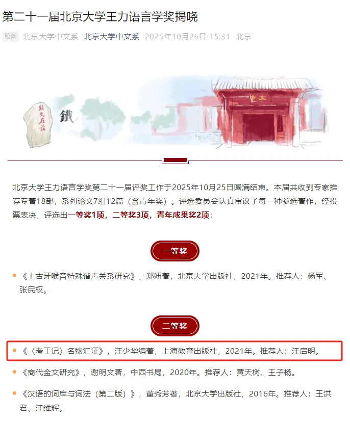 上海教育出版社出版的汪少华先生编著的《〈考工记〉名物汇证》一书再获殊荣,被评为第二十一届北京大学王力语言学奖二等奖。本次评选结果一等奖1项、二等奖3项、青年成果奖2项。