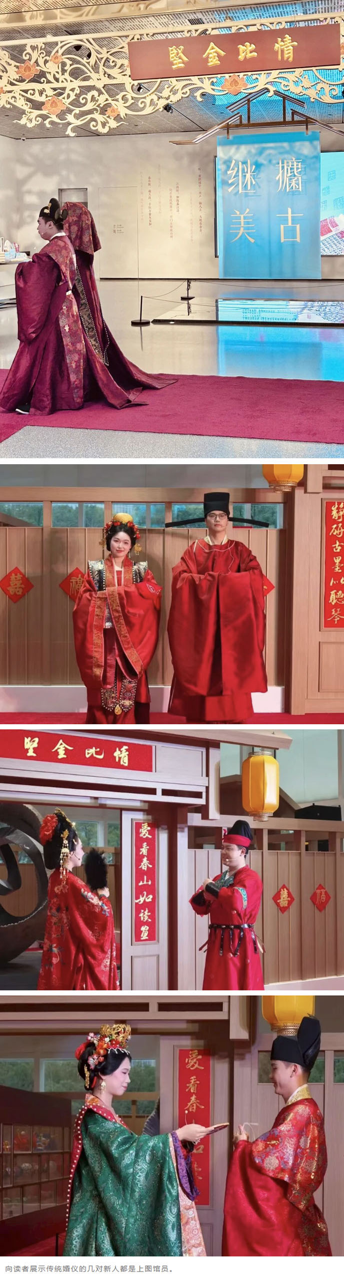 家住浦东的杨女士夫妇从下午起就“泡”在图书馆里,听上海图书馆研究馆员郭立暄带来的“从《滂喜斋藏书记》看潘祖荫所藏宋元本”,在宝山罗泾十字挑花、崇明土布、朵云轩等非遗技艺摊位前流连,傍晚举办的“金石良缘”传统婚仪体验更是重头戏。“遇上新人彩排,赶紧拍照,不同朝代的婚服太美了。”杨女士告诉记者,她自己1996年结婚时也曾在婚礼上穿过好几套传统婚服,“当时只知道漂亮,看到图书馆有活动,更想了解背后的门道”。听工作人员介绍几对向读者演示传统婚仪的新人都是图书馆员,她忍不住感慨:“现在的馆员太全能了,图书馆也太全面了。”