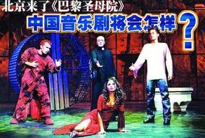 其实,中国的音乐剧发展已经有许多年了。如果您听见这句台词一定不会陌生:“马兰花,马兰花,风吹雨打都不怕……”这出曾经首演于1956年“六一”儿童节的大型民族音乐童话剧,是新中国成立以后最早的一出音乐剧了。由于种种原因音乐剧舞台一直没有发展起来,直到20世纪90年代才开始又出现了一些相对繁荣的局面。1995年在北京上演的《秧歌浪漫曲》,1997年在香港上演的由张学友和林忆莲主演的《雪狼湖》,尤其是2001年2月台湾著名歌手蔡琴主演的歌舞剧《天使不夜城》在北京保利剧院上演更是引起了大家对音乐剧这种艺术形式的极大兴趣。尽管如此,音乐剧在中国才刚刚起步。《巴黎圣母院》来京演出势必会引发中国观众对音乐剧的关注,但是,能否就此给中国音乐剧市场添把火?