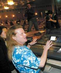 大会堂将变成“音乐厅” 昨天(4日),记者来到人民大会堂舞台的施工现场,只见中外工作人员正在紧张地忙碌着。留着一头狮子般金黄色头发的《卡萨布兰卡》的音响设计师乔·卡索十分兴奋,他对在场的记者宣称,他将把人民大会堂变成音响效果极佳的音乐厅。以往作为会议场所的人民大会堂向来是音响师们最为头疼的地方,卡索如何才能达到他所说的预期效果成了众位记者的疑问。卡索解释说:“这部戏的音乐全部都是在洛杉矶提前制作完成的,我们确保人们将能通过在这里欣赏到的音乐,感受电影中的原汁原味。同时我们采用了‘5.1’的环绕立体声音响技术,在舞台上设置30多个音箱,而在观众席的后方则有8个音箱,这些设备均采用上海制造的‘INPACT’牌音响。”如果要达到音乐厅的效果,偌大个大会堂的声音延时成了问题。据卡索说,技术人员已经对大会堂各个位置进行了测量,应当可以保证在每个位置的观众都可以感受到完美的环绕声效。为了让记者感受一下音响效果,卡索还走到观众席最后一排的音响控制台实地操作了一把。