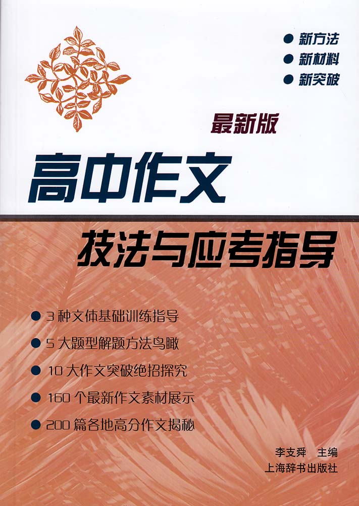 欲把金针度与人——序第一章 写作基础 一、文似看山不喜平——怎样写记叙文? 二、此曲只应天上有——怎样写论文? 三、尽是人间第一流——怎样写说明文?第二章 题型之窗 一、春风得意马蹄——命题作文怎样审题? 二、东风夜放花千树——半命题作文怎样拟题? 三、淡妆浓抹总相宜——话题作文怎样审题? 四、为有源头活水来——新材料作文怎样审题? 五、百舸争流千帆竞——小作文怎样写?第三章 突破绝招 一、竹外一枝更好——“立意”怎样创新? 二、二月春风似剪刀——“结构”怎样合理? 三、语不惊人死不休——“语言”怎样锤炼? 四、谁持彩练当空舞——“选材”怎样丰富? 五、万水千山总是情——“感情”怎样真挚? 六、琵琶起舞换新声——“文体”怎样变化? 七、看拟寻常最奇崛——“题目”怎样突出? 八、一年好景君须记——“开头”怎样简洁? 九、今日听君歌一曲——“结尾”怎样新颖? 十、春江水暖鸭先知——“题记”怎样巧设?第四章 材料大观 一、风物长宜放眼量——关注自我 二、人间有味是清欢——关注人生 三、有情芍药含春泪——关注亲情 四、秋水共长天一色——关注自然 五、世事洞明皆学问——关注社会 六、落红不是无情物——关注环保 七、别有天地非人间——关注科学 八、好山好水看不足——关注文化 九、满园春色关不注——关注课本 十、千树万树犁花开——关注热点 十一、一树一叶总关情——“感动中国”人物第五章 题目天地 一、此日中流自在行——作文应考题与点拨 二、江草江花处处鲜——历年高考语文作文题一览