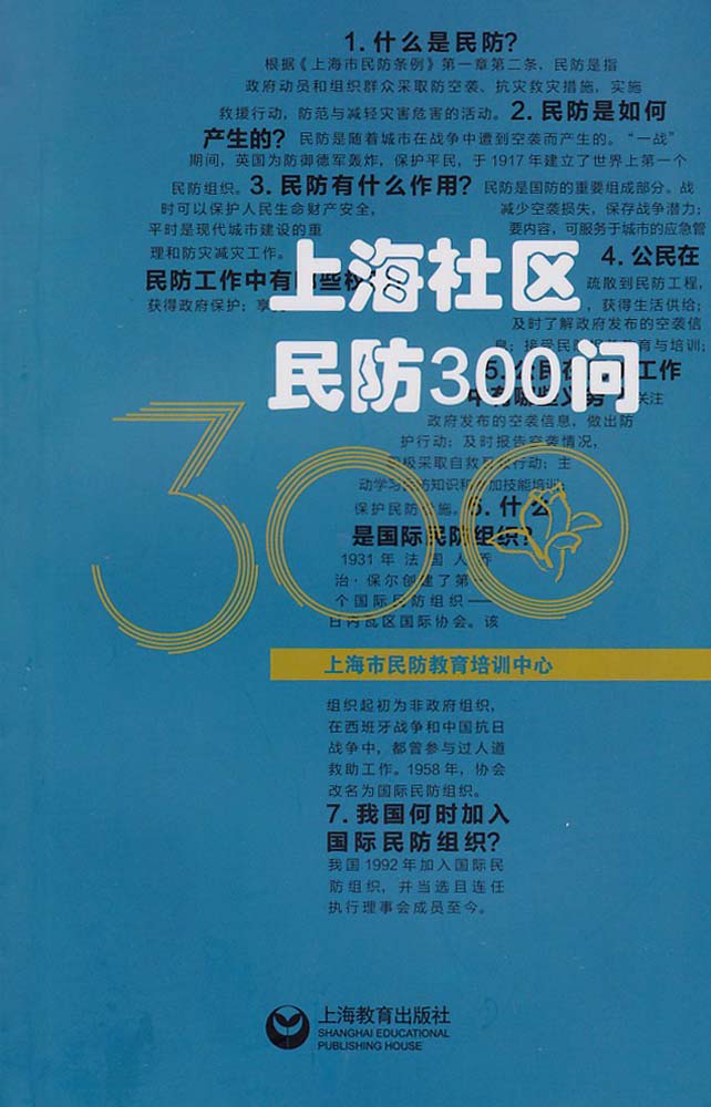 《上海社区民防300问》以帮助社区民防干部和志愿者做好社区民防工作,普及民防知识为目的。全书分为“社区民防工作”“防空防灾知识”上下两个篇章,包括民防概述、社区民防建设、人防基本知识、防灾减灾措施、现场急救技能、心理防护手段六个方面内容,体现了上海特色、民防特性、社区特点。全书以300个问答形式展现,内容通俗易懂、言简意赅,具有可读性、实用性、操作性,对于普及民防知识、加强社区民防建设,提高民众防空防灾知识与技能有一定的参考价值。