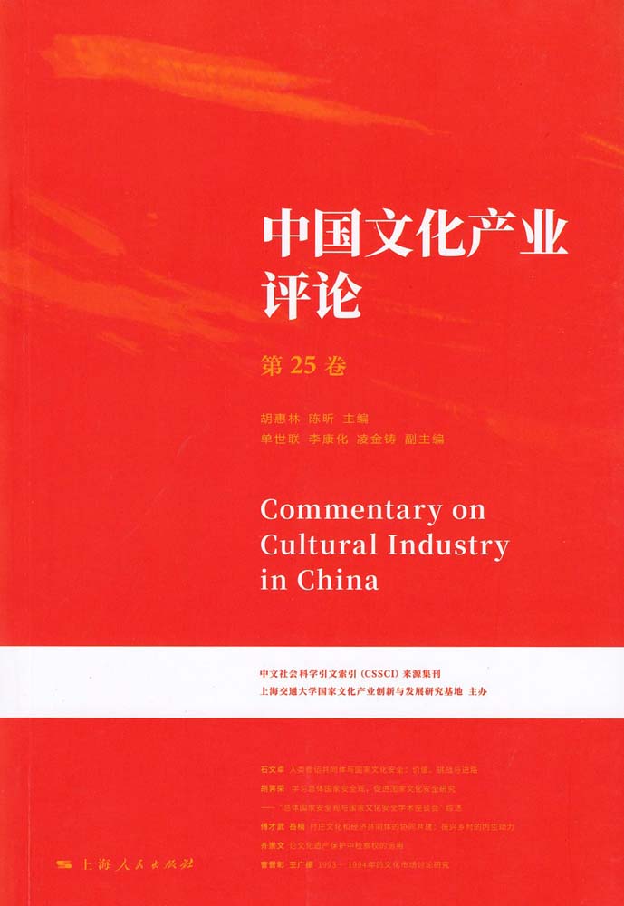 学习总体国家安全观与国家文化安全人类命运共同体与国家文化安全:价值、挑战与进路国家文化安全视域下的边疆民族认同研究国家文化安全中的意识形态安全及其当代境遇国民教育:实现总体国家文化安全的重要路径话语融入方能价值引领——国家文化安全的实现路径学体国家安全观,促进国家文化安全研究——“总体国家安全观与国家文化安全学术座谈会”综述理论探讨基于计量经济学理论的艺术产品价格评估方法创新微媒介:一种文化与经济的交易地带如何推进文化科技深度融合?——刍议一个“六位一体”的行动框架文化政策联合国教科文组织与文化政策研究:20世纪七八十年代村庄文化和经济共同体的协同共建:振兴乡村的内生动力论文化遗产保护中检察的运用突破与困境:上海话剧艺术中心的体制改革文化生产纪录片的文化生产:中国形象的生成与变迁“一带一路”西北路线电视媒介的发展与竞争态势——基于生态位理论与内容资源的实证分析重建具有中国式现代性品质的物质生活世界——以后乡土中国乡村精品民宿设计中的物感凸显为中心武汉动漫产业发展的现状、问题及其对策文化区域台湾特色小镇的地方意识关于北京―张家口地区整体建设冬季运动目的地游客印象感知的研究皖南非物质文化遗产时空结构研究文化人才文化创意人才的“树形培养模式”的建构与应用传统技艺类非物质文化遗产的现代学徒制探析——以芜湖铁画为例学术史研究1993―1994年的文化市场讨论研究书评艺术与商业的拉扯——“文化工作的政治”走向何方?编后记约稿启事