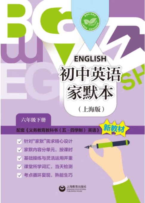 本书紧扣《义务教育教科书(五·四学制) 英语 六年级下册》新教材各单元内容编写,旨在帮助学生通过每天做一些多样化的默写练习,轻轻松松地复习并巩固课堂所学内容,做到课课清、日日清和周周清。每单元对应教材板块提供配有分值的7个家默练习和1个单元总默写,与教材页码相对应。各个单元的家默练习部分包含单词与词组默写、词汇活用练习(如选词填空、首字母填空)等多种题型,供学生进行词汇学习情况的即时自我检测;单元总默写部分则通过多种词汇活用练习对本单元中需要重点掌握的词汇进行综合考查,帮助学生及时查漏补缺。每个单元的家默练习7都标注了星号,可供学有余力的同学选择使用。此外,在每个家默练习最后均配有一句英语名言或谚语,供学生积累运用;同时设有Notes栏目,供学生即时记录错题或学习要点,以便进行针对性复习巩固。