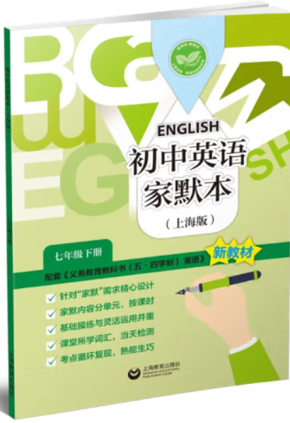 本书紧扣《义务教育教科书(五·四学制) 英语 七年级下册》新教材各单元内容编写,旨在帮助学生通过每天做一些多样化的默写练习,轻轻松松地复习并巩固课堂所学内容,做到课课清、日日清和周周清。每单元对应教材板块提供配有分值的7个家默练习和1个单元总默写,与教材页码相对应。各个单元的家默练习部分包含单词与词组默写、词汇活用练习(如选词填空、首字母填空)等多种题型,供学生进行词汇学习情况的即时自我检测;单元总默写部分则通过多种词汇活用练习对本单元中需要重点掌握的词汇进行综合考查,帮助学生及时查漏补缺。每个单元的家默练习7都标注了星号,可供学有余力的同学选择使用。此外,在每个家默练习最后均配有一句英语名言或谚语,供学生积累运用;同时设有Notes栏目,供学生即时记录错题或学习要点,以便进行针对性复习巩固。
