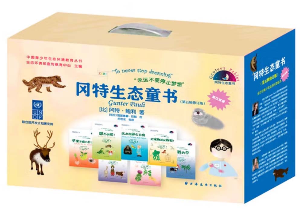 《冈特生态童书》是生态环境部宣传教育中心组织引进的一套以生态环保为主题、面向青少年的科普知识绘本,其核心思想是“不要奢望让地球为我们创造更多资源,而要更善于利用地球现有的资源”。整套书共十辑(360种)。每年出版1辑(36种),分为七大主题:水、食物、居住、健康、能源、工作、教育,讲述了36则生动有趣的故事。在每个故事之后,作者还特别设计了背景知识、知识链接、情智培养、延伸讨论与艺术创造等辅助内容。通过阅读这套童书,青少年不仅能了解自然、与大自然相处共生,还能接触更多的相关科学知识,增进情商、艺术表现力和创造力。通过处处可见的自然界的奥秘、科学的乐趣,让青少年明白自然界每个小小的点相互连接,就能织成大大的未来。同时这套童书还以中英双语形式呈现,很适合作为双语阅读材料使用,让孩子在学习生态环保知识的同时提高英文水平。